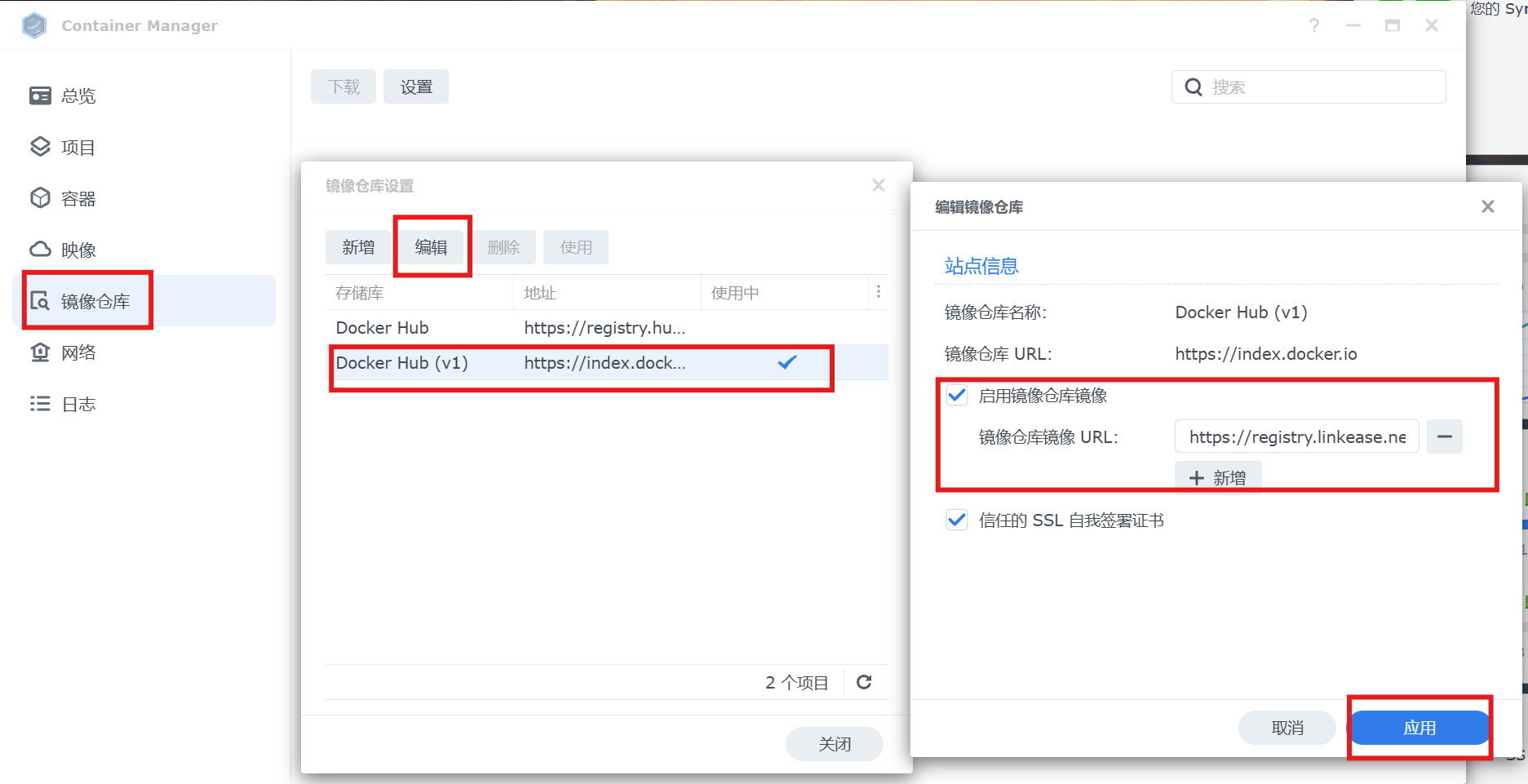打开 ContainerManager 控制面板,点击【镜像仓库】-【设置】-【编辑】