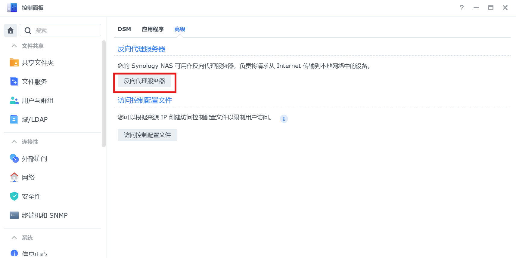 我们打开【控制面板】-【登录门户】-【高级】-【反向代理服务器】
